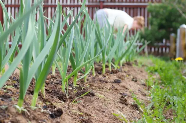 Ухаживают за чесноком, растущим на одной плантации с клубникой, точно так же, как если бы культура росла в одиночестве: важен своевременный полив, нужно проводить рыхление, вносить подкормки. Только все агротехнические мероприятия проводят весьма аккуратно, чтобы не «встревожить» соседку.
